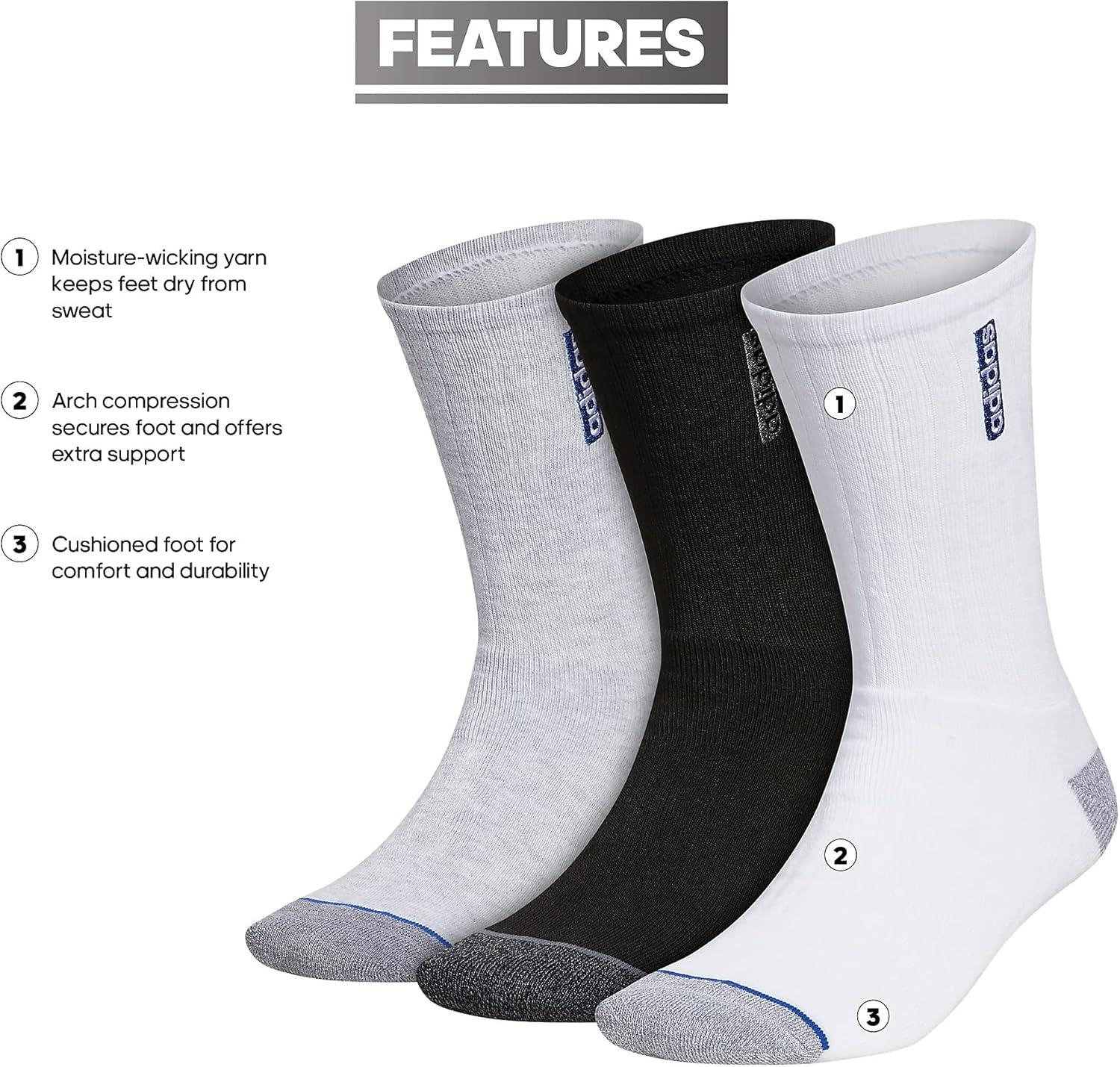 A smart addition to your sock drawer. These crew-length adidas socks are the kind you'll reach for often. Made from moisture-wicking yarn, they keep feet dry while wrapping snugly around the arch. The cushioned footbed helps protect high-impact areas.