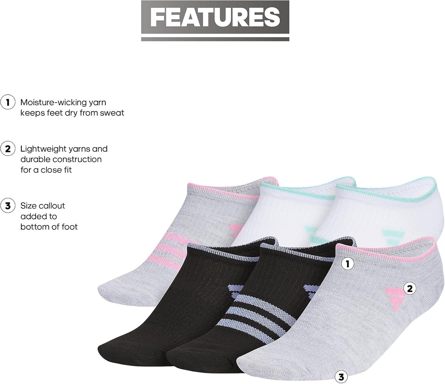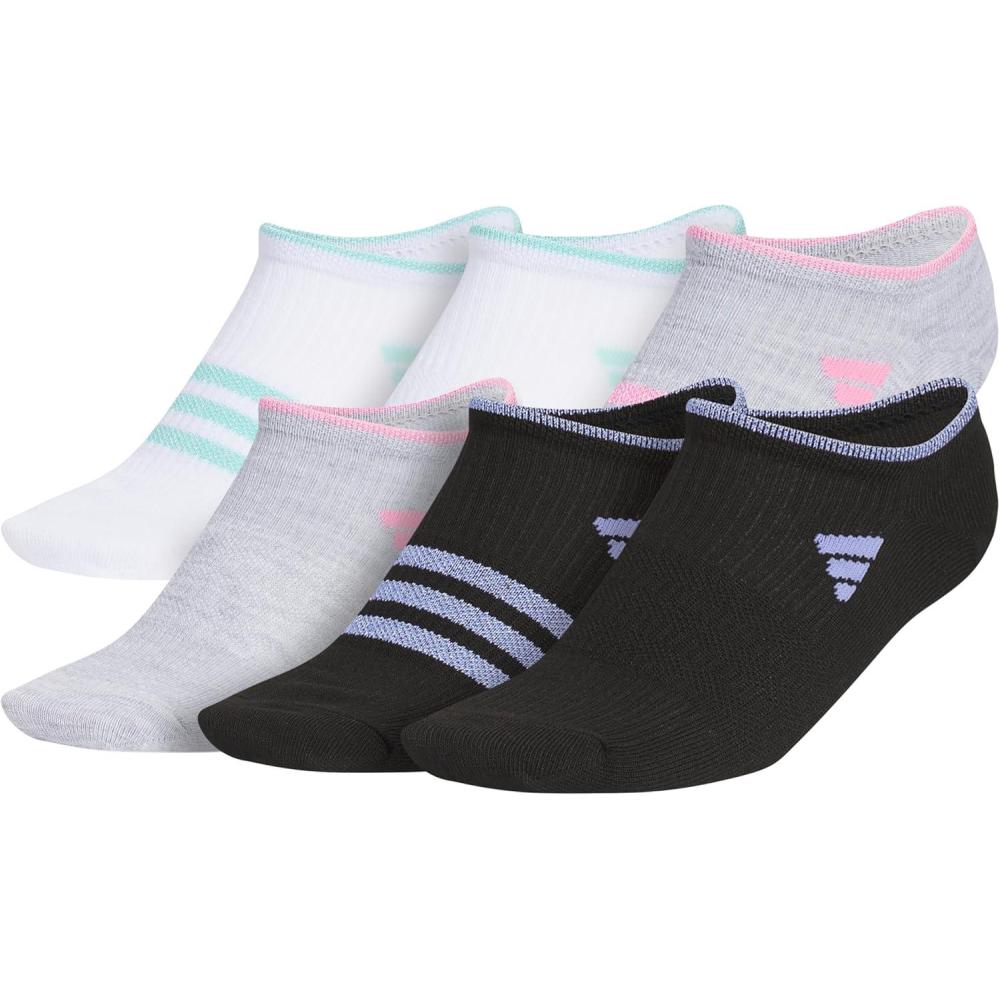 adidas Unisex Kids No Show Socks for Boys and Girls Youth (6-Pack) Superlite Breathable and Lightweight, Below Ankle(White/Cool Light Heather/Black/Girls/3.0)